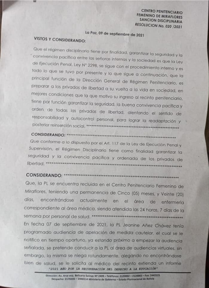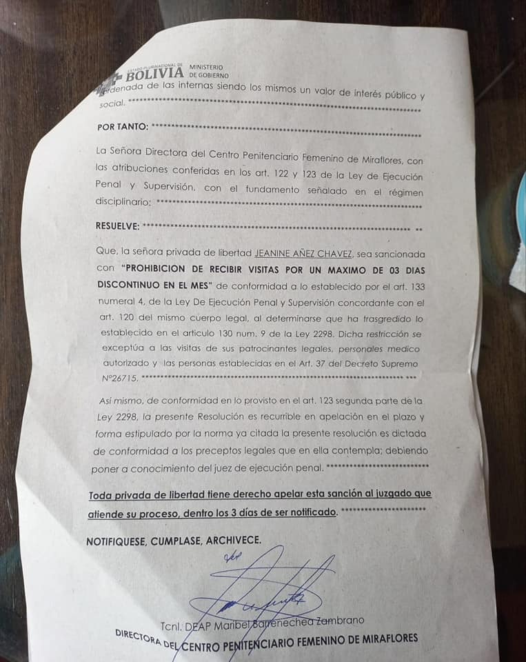 El director departamental de Régimen Penitenciario confirmó que la gobernadora del penal de Miraflores sancionó a Jeanine Añez con 3 días de suspensión de visitas familiares por haber transgredido las normas penitenciarias, ya que el pasado 7 de septiembre, pese a haber sido notificada, no quiso participar de una audiencia virtual de apelación en el denominado caso golpe de Estado y arguyendo delicado estado de salud. Si su defensa no impugna esta decisión la sanción sería aplicada desde este miércoles.