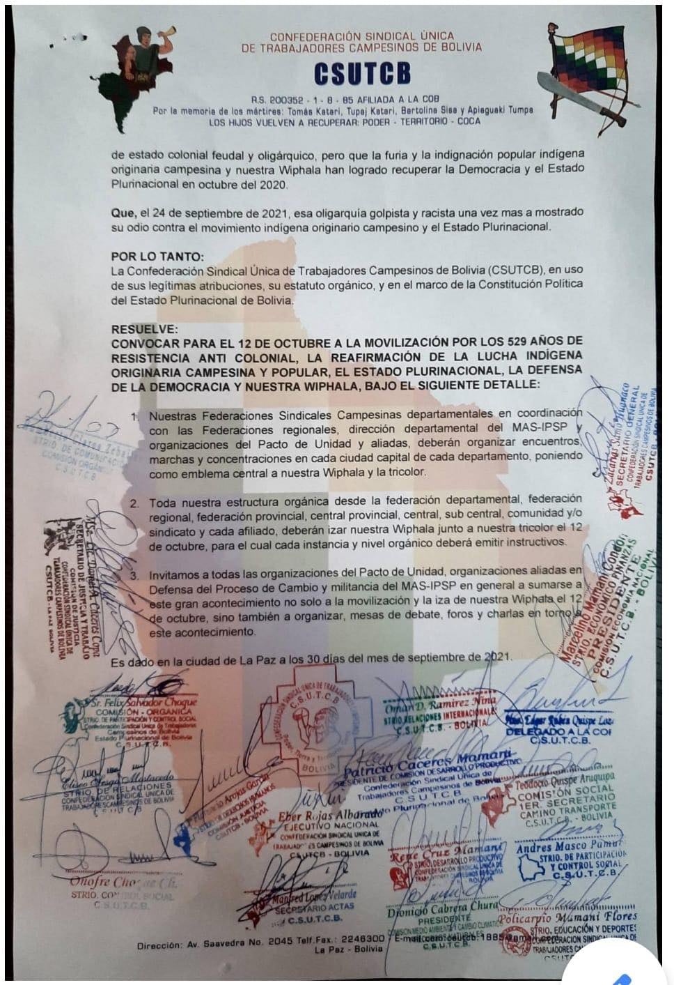 #CSUTCB se declara en emergencia y convoca a movilización el 12 de octubre en defensa de la #Wiphala
