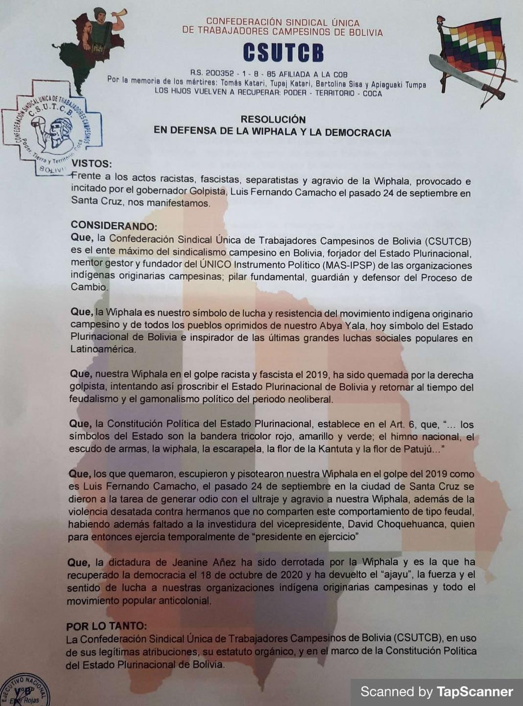 La CSUTCB también anuncia su respaldo a las acciones legales contra el gobernador de Santa Cruz, Luis Fernando Camacho y Rómulo Calvo por «violentar» la Wiphala. Asimimso, instruye a sus bases izar la Wiphala en cada aniversario ya sea departamental o nacional.