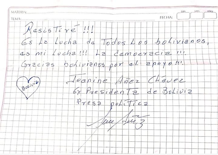 bolivianos.«¡Resistiré! Es la lucha de todos los bolivianos, es mi lucha. ¡La democracia! Gracias bolivianos por el apoyo», señala la carta.