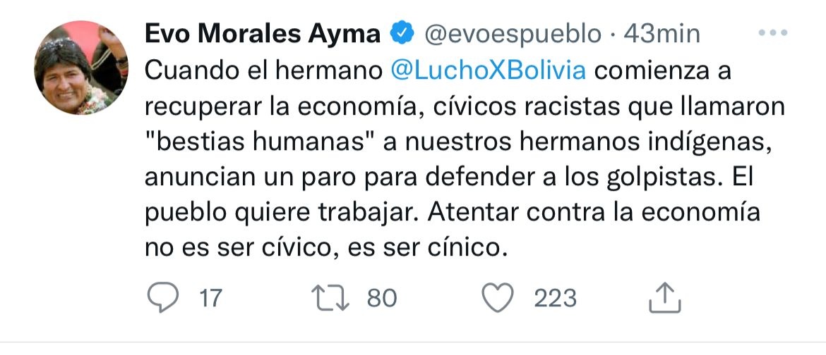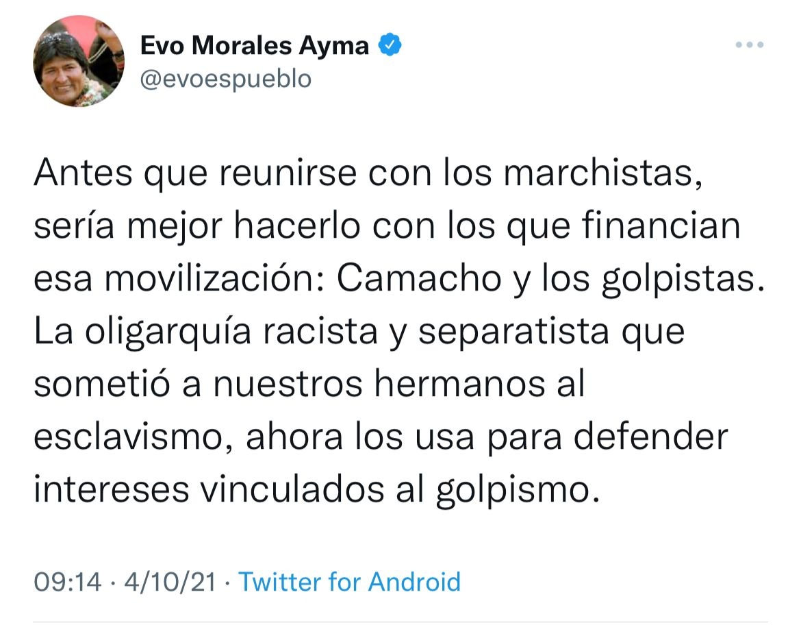 Evo Morales opina desde el Twitter sobre el paro cívico convocado para el 11 de octubre.