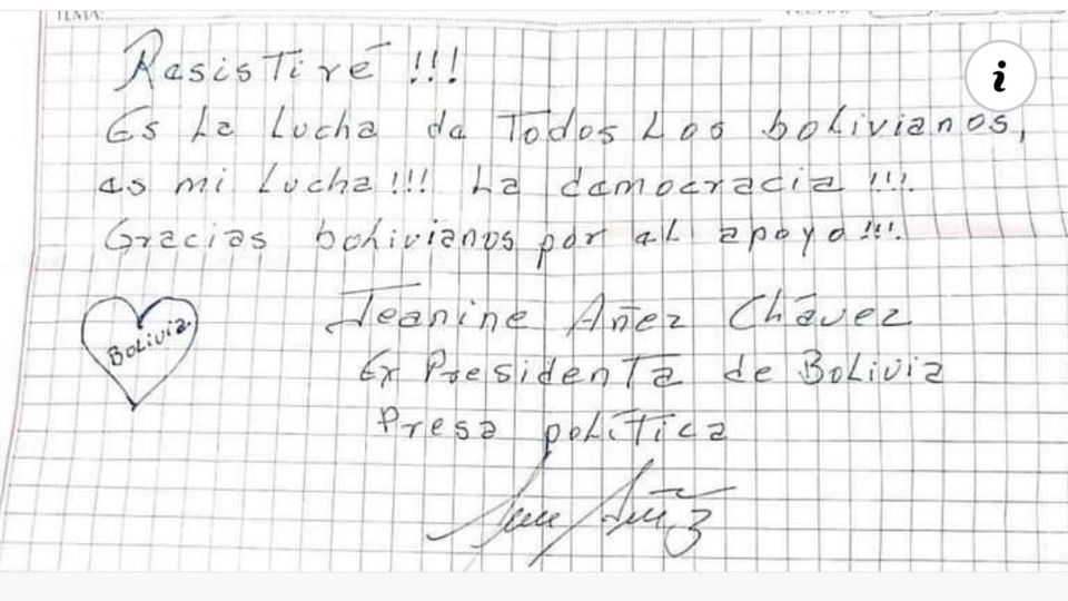 El diputado Amilkar Barral visitó a Jeanine Áñez en la cárcel y presentó esta carta que envía la ex mandataria que agradece a los bolivianos por el apoyo.