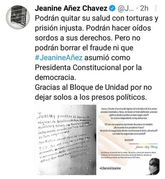 Desde las redes, Añez agradece al bloque de unidad no abandonar a presos políticos