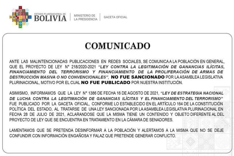 La Gaceta Oficial de Bolivia, a través de un comunicado, aclaró que el Proyecto de Ley Contra la Legitimación de Ganancias Ilícitas no fue sancionado por la Asamblea Legislativa, por lo que no fue publicado por esta institución.