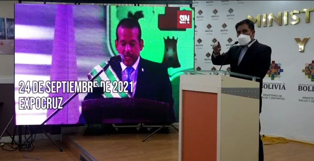 Luis Fernando Camacho, a quien acusa de hacer politiquería barata con datos que no son reales respecto a la vacunación anticovid. Aseguró que el objetivo de Camacho en sus discursos es la convulsión y señaló que no permitirá hacer política con la salud.Fuente: Detrás de la Verdad