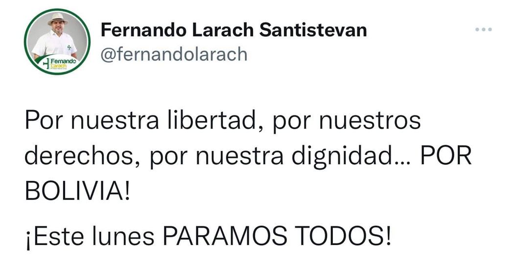 Vicepresidente Comité Pro Santa Cruz: ‘Por nuestra libertad, por Bolivia, este lunes paramos todos’