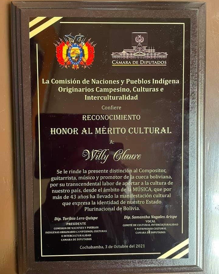 El compositor y músico Willy Claure recibió reconocimiento de Honor al Mérito Cultural del Legislativo por su contribución a la cultura Boliviana.