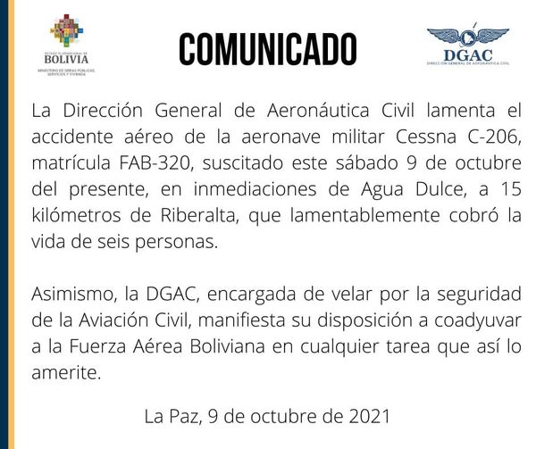 DGAC lamenta accidente de la FAB y manifiesta su disposición para coadyuvar en i