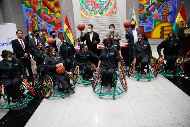 de ruedas para garantizar su participación en el torneo sudamericano de esa disciplina deportiva. El acto se realizó ayer en la Casa Grande del Pueblo con la presencia del Primer Mandatario, Luis Arce, y otras autoridades.El Presidente del Estado destacó la acción conjunta, que permitió la entrega de la donación de sillas de ruedas especiales para practicar el básquetbol, a partir de las gestiones realizadas por la Ministra de la Presidencia, María Nela Prada, para que el equipo masculino y femenino participe de un campeonato que se realizará en la capital de Argentina, Buenos Aires.