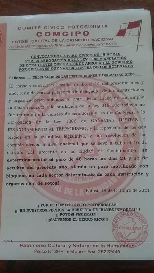 #Potosí: Comcipo anuncia paro de 48 horas para el jueves y viernes, exigen abrogación de la Ley 1386