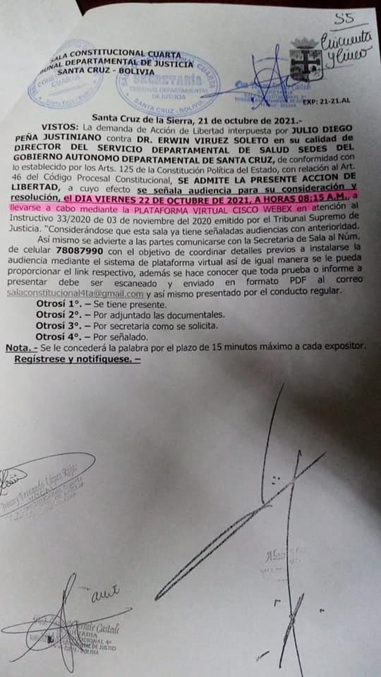 Sin embargo y pasando por encima de la decisión del Sedes que busca precautelar la salud de los ciudadanos, los abogados de la Clínica Santa María presentaron una acción constitucional que será resuelta este viernes por la sala constitucional cuarta compuesta por los vocales Jimmy López y Alain Nuñez.