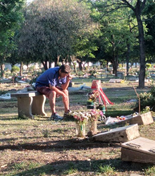 Un Padre escuchando el relato del partido de San Martin junto a la tumba de su hijo , un hijo que perdió su vida en la ruta siguiendo al equipo de sus amores”,