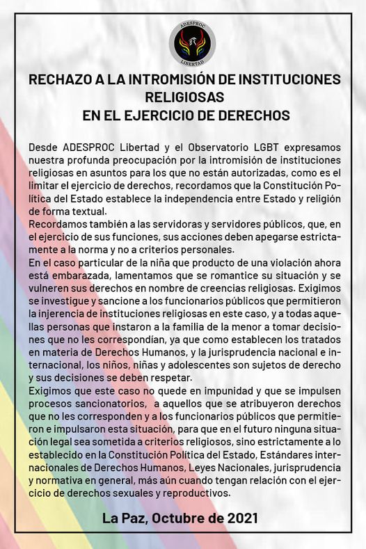 La Asociación Civil de Desarrollo y Promoción Cultural Libertad y el Observatorio LGTB expresaron su rechazo a la intromisión de instituciones religiosas en el caso de la niña de 11 años víctima de violación y que quedó embarazada. Exigen que este caso no quede en impunidad y que se impulsen procesos sancionatorios.