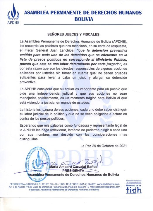 La Asamblea Permanente de Derechos Humanos de Bolivia emitió un pronunciamiento donde dirigido a jueces y fiscales donde afirma que la historia juzgará sus acciones y que deben distinguir su labor judicial de lo político.