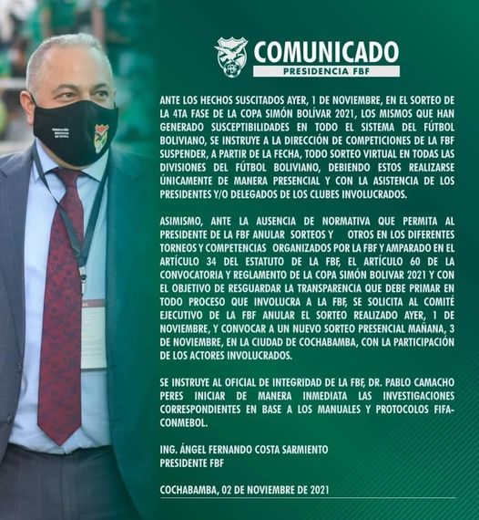La Federación Boliviana de Fútbol RESUELVE ANULAR EL SORTEO desarrollado el día de ayer E INSTRUYE A REALIZAR UN NUEVO SORTEO de las llaves de los cuartos de final de la Copa Simón Bolívar 2021.