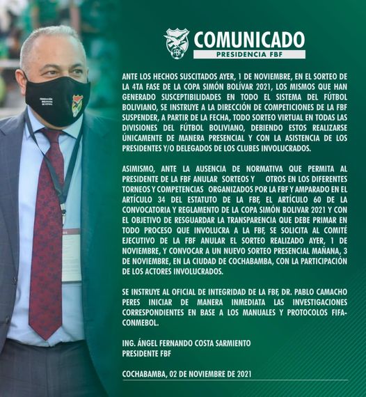 La Federación Boliviana de Fútbol (FBF) solicita al Comité Ejecutivo de la entidad anular el sorteo de la Copa Simón Bolívar, tras las denuncias del club Torre Fuerte de Santa Cruz sobre un presunto amaño.