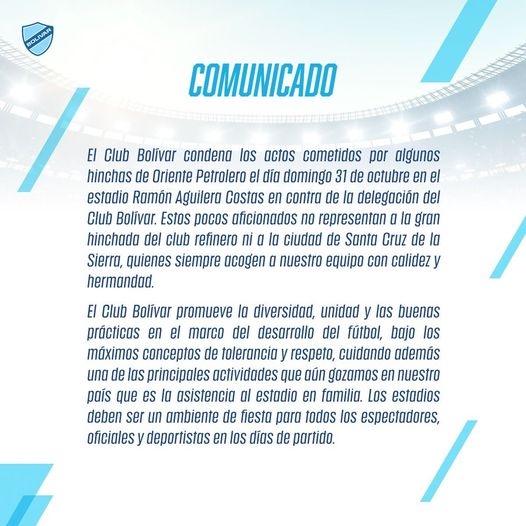 Bolívar se pronunció sobre los gritos de algunos seguidores de Oriente a parte de la comitiva de Bolívar en el partido que de jugó en el estadio Tahuichi Aguilera.
