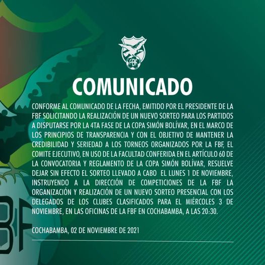 Comité ejecutivo de la Federación Boliviana de Fútbol deja sin efecto el sorteo de la copa Simón Bolívar fase 4.