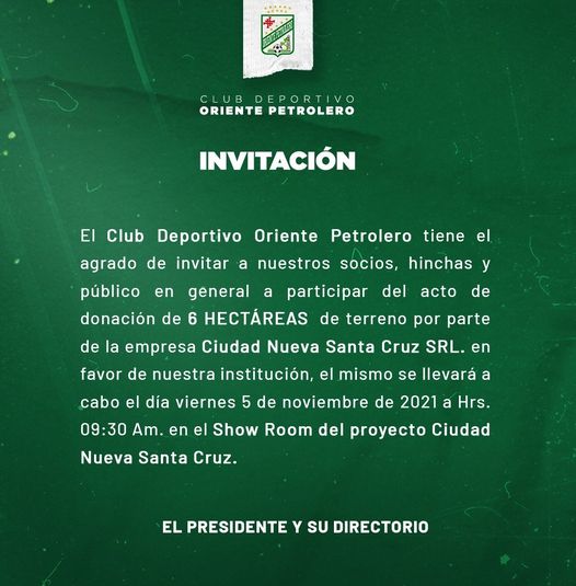 Oriente Petrolero recibirá 6 hectáreas de terrenos, donadas por Ciudad Nueva Santa Cruz.