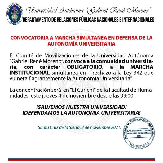 El Comité de Movilizaciones de la Universidad Autónoma Gabriel René Moreno convoca a una movilización para este jueves en rechazo a la Ley del Plan de Desarrollo Económico y Social porque consideran que esta norma vulnera flagrantemente la autonomía universitaria.