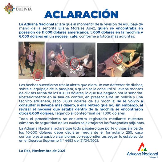 La Aduana Nacional aclara situación de revisión de equipaje de mano de una ciudadana, quien se encontraba en posesión de 11.000 $us y que previa consulta negó llevar consigo ese monto de divisas y que no declaró en el formulario 250.