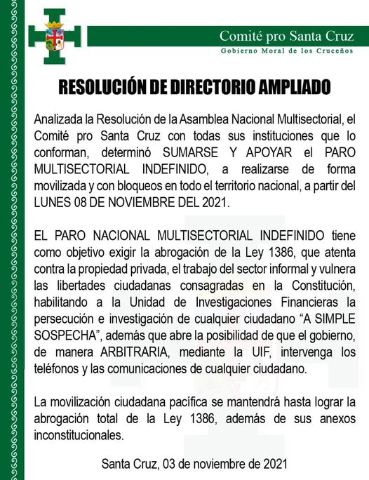 Comité Pro Santa Cruz emite Resolución en la cual determina sumarse y apoyar el paro multisectorial indefinidoCategorías NoticiasEtiquetas , Detrás de la Verdad, Facebook 04/11/2021 Fuente: Detrás de la Verdad