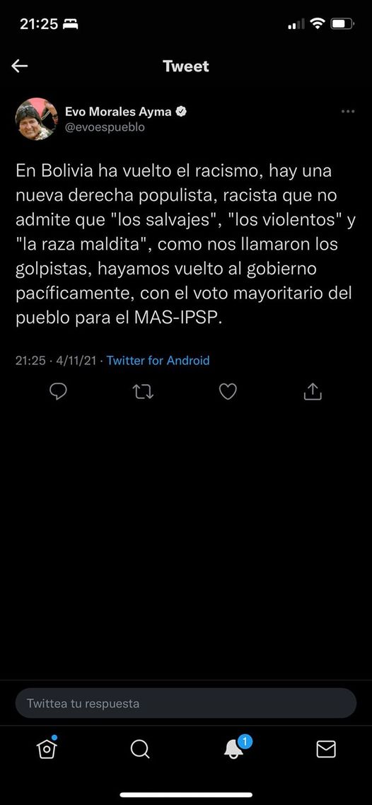 Ex presidente Evo Morales caldea los ánimos en redes sociales, con argumentos que apelan al racismo y la discriminación.