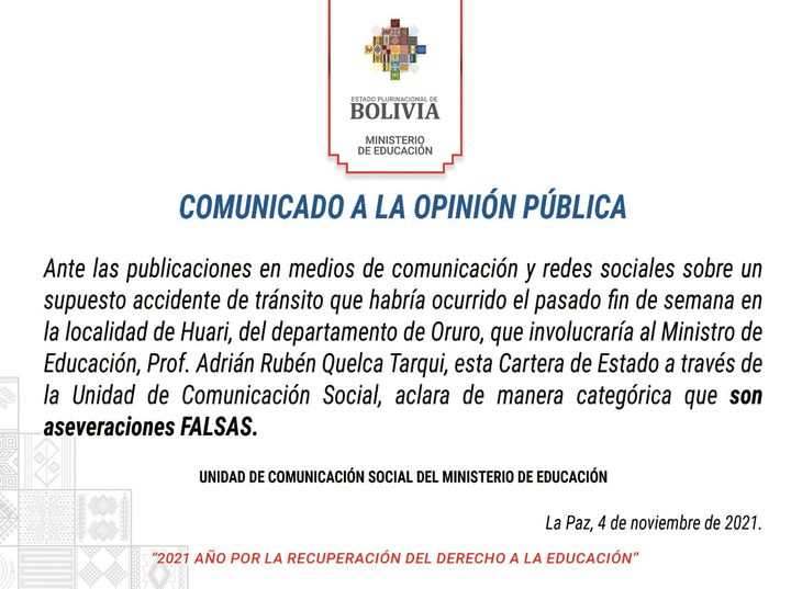 A través de un comunicado, el Ministerio de Educación, niega que el ministro de esta cartera esté estado involucrado en un accidente de tránsito en Huari.