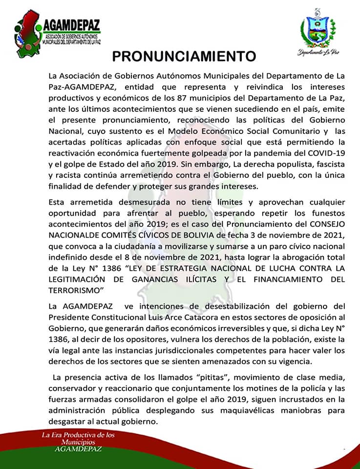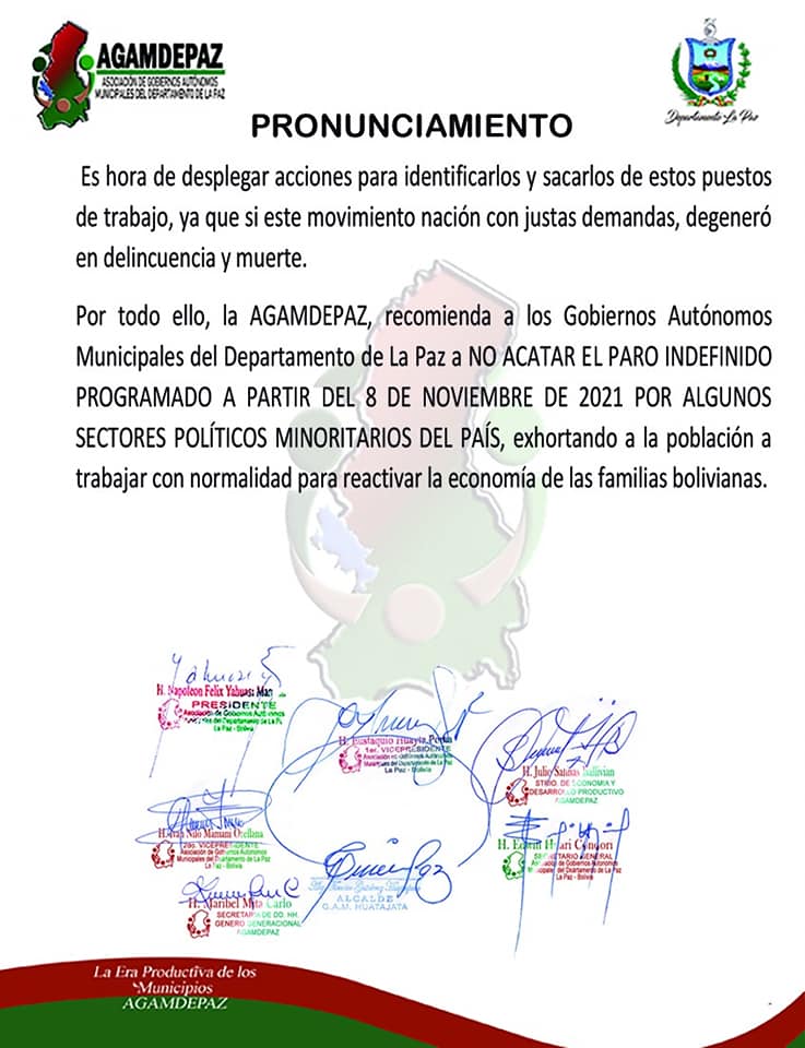 La Asociación de Gobiernos Autónomos Municipales del Departamento de La Paz señaló que ve intenciones de desestabilización al Gobierno Nacional y recomienda no acatará el paro de este 8 de noviembre.