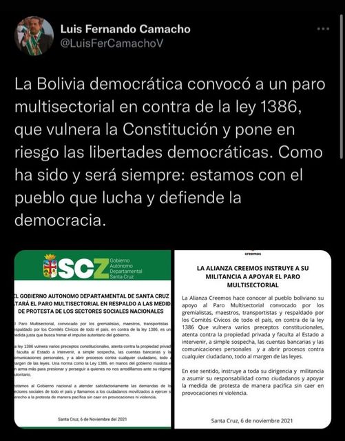 El Gobernador Luis Fernando Camacho se pronuncia y dice que apoyará el paro cívico del lunes.