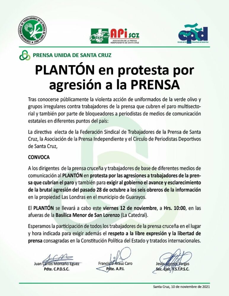 #Último #ANF La "Prensa Unida de Santa Cruz" convoca para el 12 de noviembre a un plantón en la catedral Basílica Menor de San Lorenzo en protesta por las agresiones a los trabajadores de la prensa. pic.twitter.com/S1ade9Dvlz