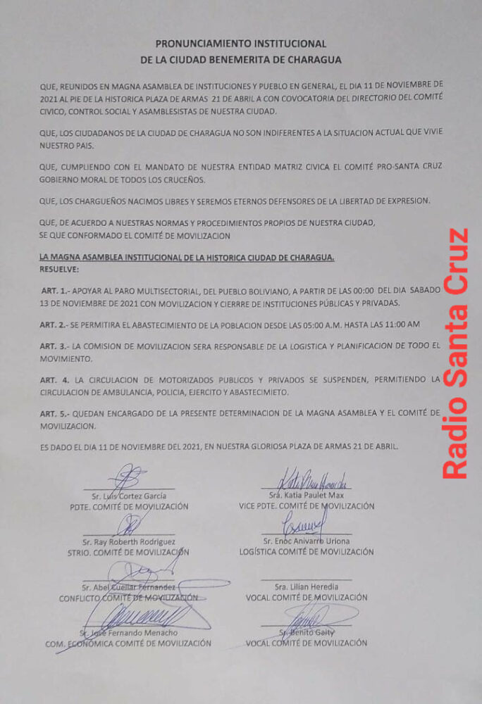 #ANF Charagua Pueblo resuelve sumarse al paro cívico multisectorial a partir de este sábado para exigir la abrogación de la Ley 1386.