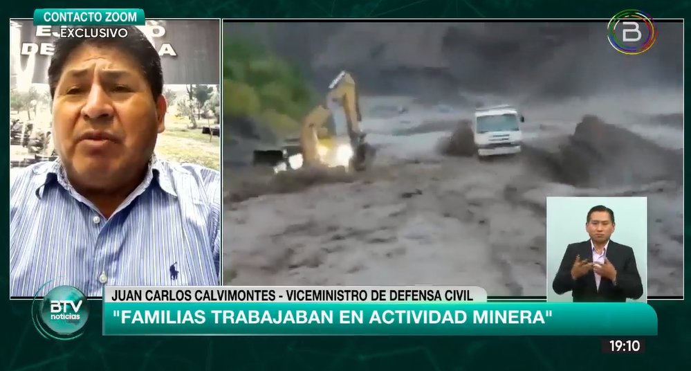 #Ahora El viceministro de Defensa Civil, Juan Carlos Calvimonte, informa que se presume que las dos personas desaparecidas están atrapadas en las “fosas de agua del río Mapiri”. Un equipo especializado realiza el trabajo de búsqueda de las víctimas, acotó.