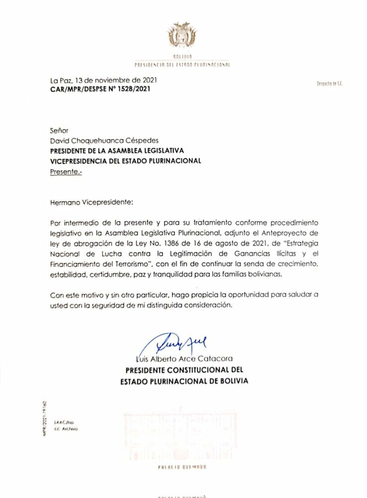 #ANF El presidente @LuchoXBolivia envió una carta al vicepresidente @LaramaDavid en el que indica que se envió el Anteproyecto de ley de abrogación de la Ley 1386 para que sea tratada en la Asamblea Legislativa. https://t.co/sHm0816XGM
