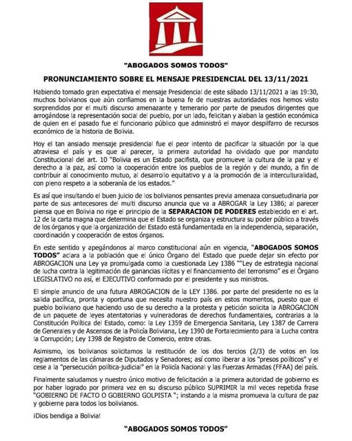 Agrupación “Abogados somos todos» felicita a Luis Arce por sólo una cosa, primera vez que en un discurso no menciona “Gobierno de Facto o Gobierno Golpista” 😂😂 Así mismo anunciaron que van por la abrogación del #Paquetazo y la restitución 2/3. Anunciaron mediante comunicado varios puntos.
