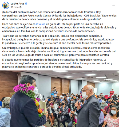 Arce: «Hace dos años se ejecutó en Bolivia un golpe de Estado por parte de una derecha sin escrúpulos, que obligó a renunciar a las autoridades democráticamente electas, bajo la violencia y amenazas a sus familias, con la complicidad de varios medios de comunicación».