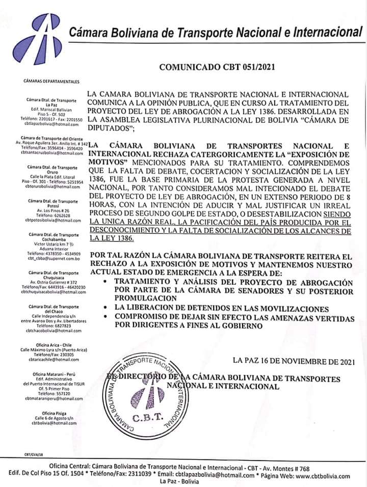 #ANF La Cámara Boliviana de Transporte Nacional e Internacional rechaza categóricamente la «exposición de motivos» del proyecto de ley que abroga la norma 1386. Aclaran que la falta de debate, concentración y socialización fue lo que ocasionó movilizaciones. https://t.co/XiKZzjzXNS