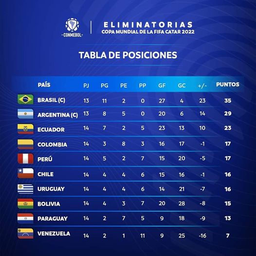 Así está la tabla a falta de 4 fechas para finalizar las duras Eliminatorias Sudamericanas.