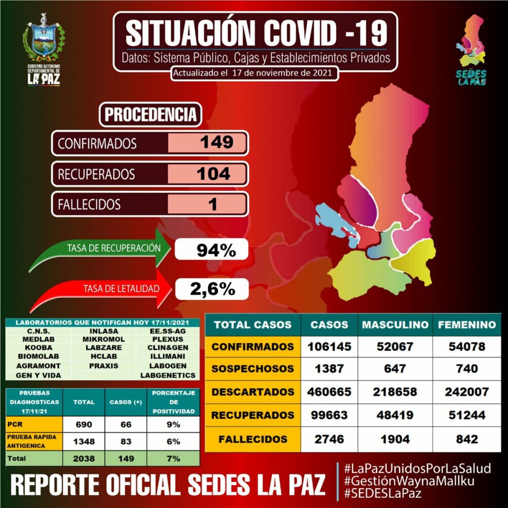#ANF Los casos diarios de #COVID19 en #LaPaz no bajan de 100. Este miércoles fueron confirmados 149 nuevos contagios, 104 recuperados y un deceso, según el reporte del Servicio Departamental de Salud de La Paz. https://t.co/41mt3BTtcT