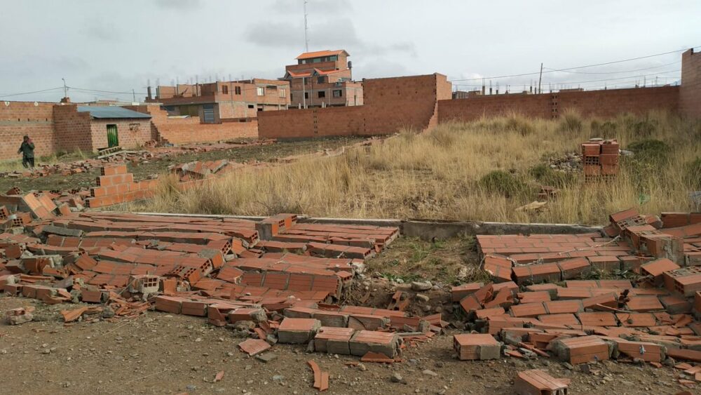 #ANF Reportan que fuertes vientos afectaron y provocaron la caída de los muros de varias casas en la zona Anexo Monje Campero, Laja, y la Urbanización Unificada Pomamaya, Distrito 9 de #ElAlto. (Vía @F10HD_BOLIVIA) pic.twitter.com/yXmb6TL129
