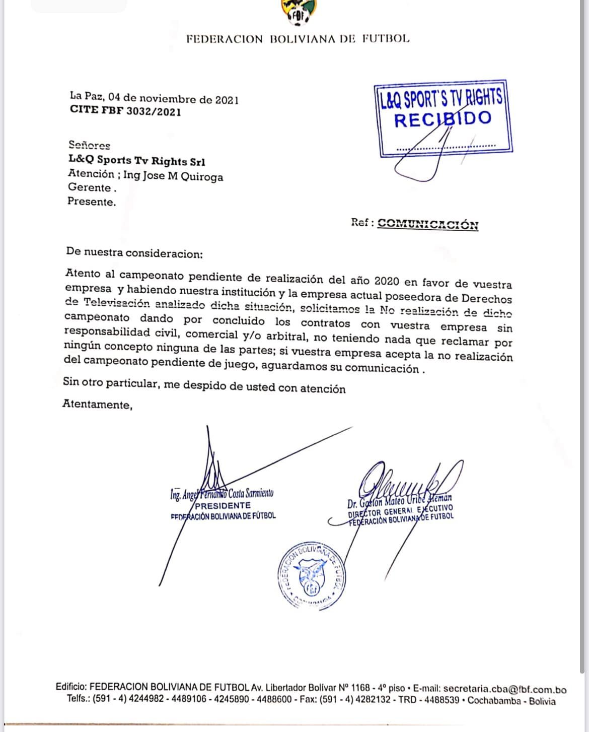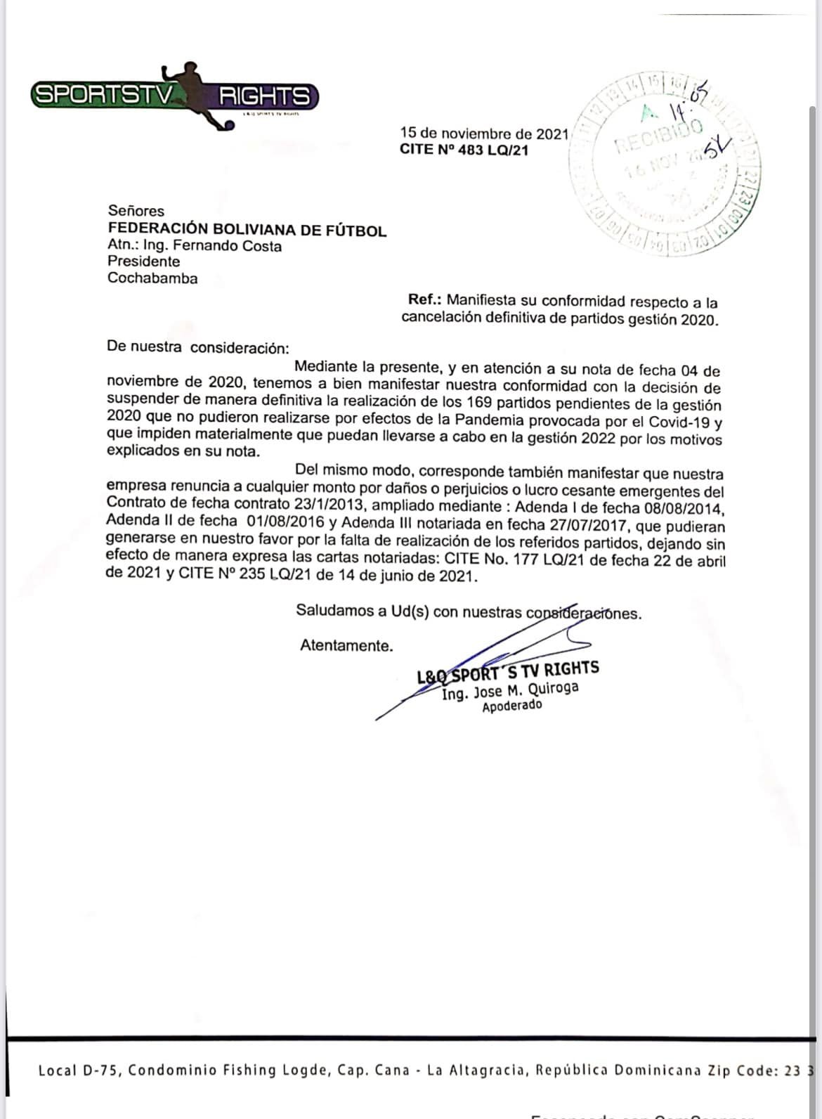 La Federación Boliviana de Fútbol envió carta a la empresa de los derechos de TV sobre los partidos o campeonato acordado para el 2022, ya recibió la respuesta de suspender los partidos y renuncia a cualquier resarcimiento económico.