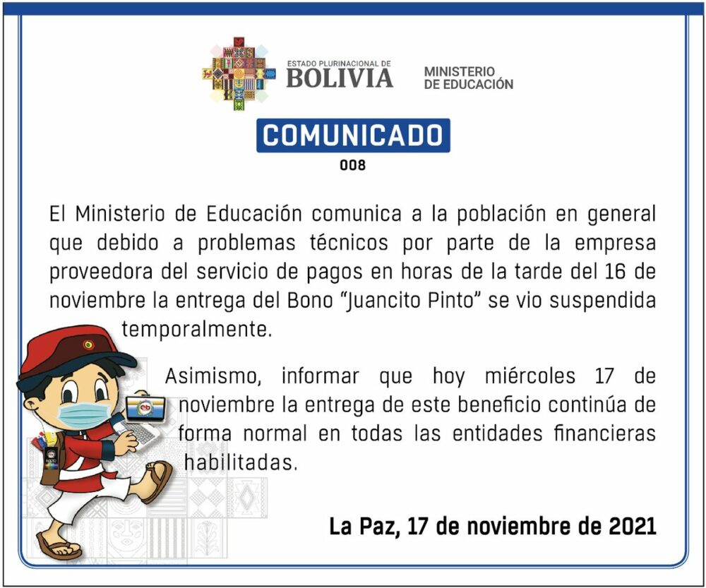 #ANF Tras la suspensión temporal del pago del bono Juancito Pinto por problemas técnicos registrados ayer, el @minedubol comunica que esta jornada se reanudó la entrega de este beneficio en todos los bancos habilitados. https://t.co/HyFeGh0byl