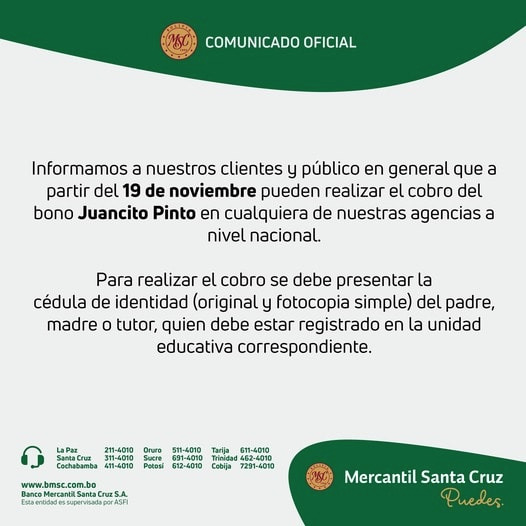 #ANF El Banco Mercantil Santa Cruz comunica que a partir de este viernes se podrá cobrar el Bono Juancito Pinto en cualquiera de sus agencias a nivel nacional. También recuerda que los requisitos son la cédula de identidad original y una copia de los papás o tutor. pic.twitter.com/wu32ZgZdSt
