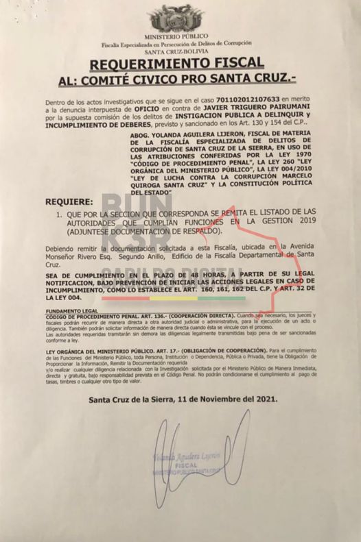 Fiscalía pide lista de autoridades del Comité Pro Santa Cruz durante la gestión 2019