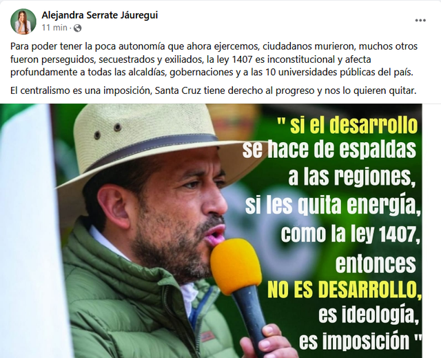 «Santa Cruz tiene derecho al progreso y nos lo quieren quitar» dijo la directora de Asistencia Ciudadana de la Gobernación al referirse a la Ley 1407