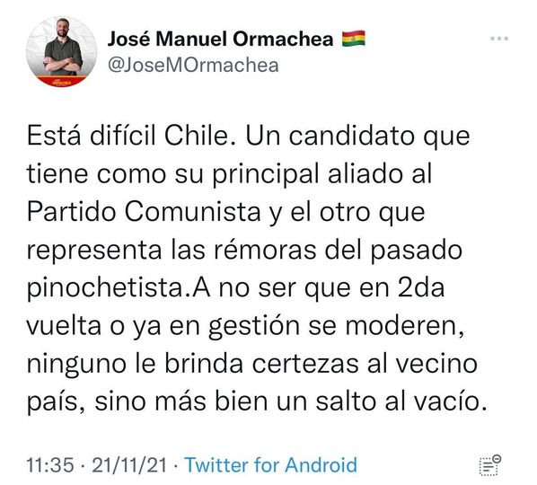 Diputado de Comunidad Ciudadana, Jose Manuel Ormachea se pronuncia en redes sobre comicios en Chile 🇨🇱