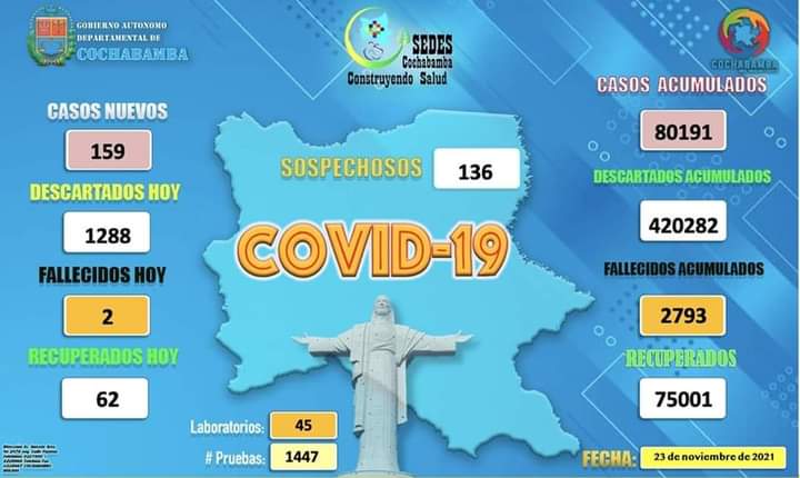 #ANF Este martes, 159 personas dieron positivo a #coronavirus y dos fallecieron en #Cochabamba, según el reporte del #Sedes. https://t.co/DqNKdCFgRu