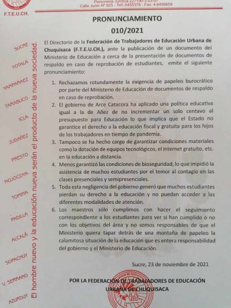 #ANF La Federación de Trabajadores de Educación Urbana de #Chuquisaca rechaza la exigencia “de papeleo burocrático por parte del Ministerio de Educación” para casos de estudiantes reprobados. pic.twitter.com/WeABXrMiL5