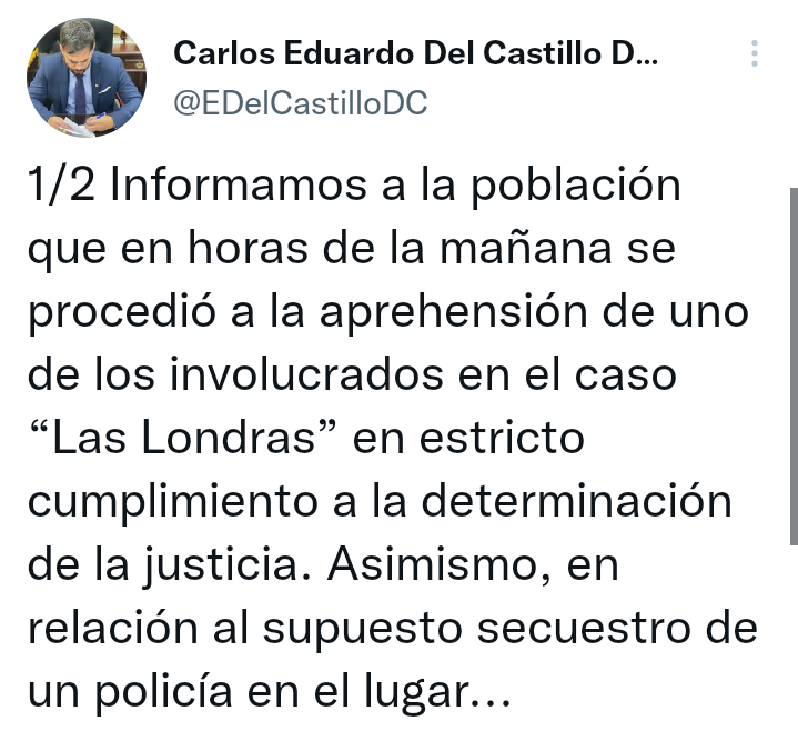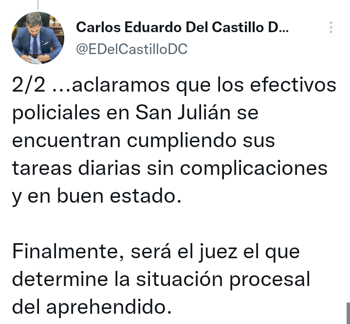 #Ultimo El ministro de Gobierno, @EDelCastilloDC, confirma la aprehensión de una persona implicada en el caso Las Londras. Asimismo, descarta el secuestro de un policía en San Julián, #SantaCruz. https://t.co/DaNVR0Jabx