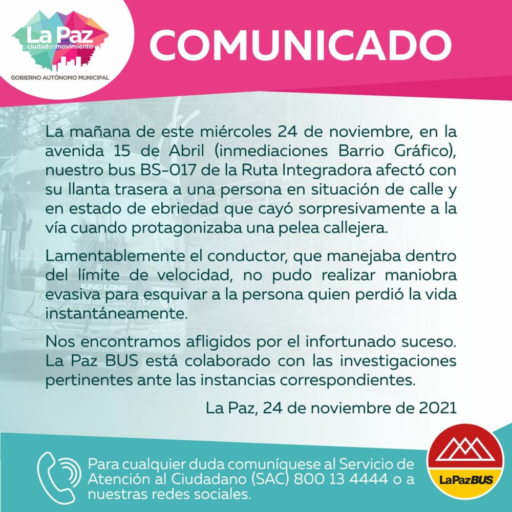 #ANF Un hombre murió atropellado por uno de los buses ChikiTiti en la avenida 15 de Abril, cerca de la plaza del Maestro en #LaPaz. Según el informe policial, el fallecido peleaba con otra persona, lo que ocasionó que uno de ellos cayera detrás de la llanta trasera del vehículo. https://t.co/Guvnutv7zU